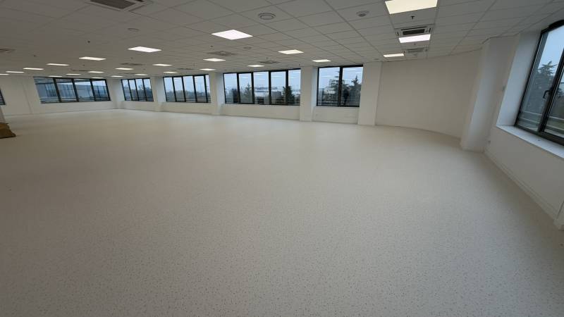 Pour des bureaux de cette envergure, le revêtement doit répondre à une double problématique : une résistance au passage intensif et une hygiène irréprochable. Nous avons préconisé la pose d'un lino PVC avec joints soudés à chaud. Cette technique garantit une étanchéité parfaite.