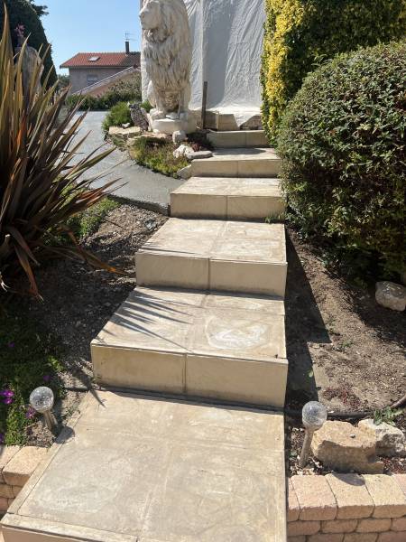 L'objectif était de préparer le terrain avec des dalles béton avant de poser des escaliers extérieurs et une terrasse en moquette de pierre sur mesure.
