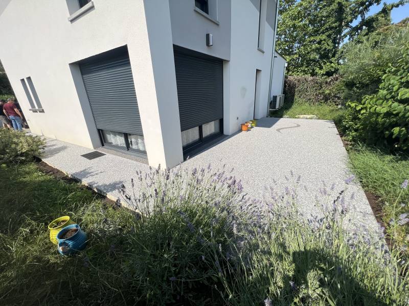 La réalisation a durée 1 jour, afin de couvrir 40m2. Nous avons décaissé, enlevé le dallage existant pour remettre à niveau et pouvoir réaliser cette pose d'une terrasse en granulat de marbre à Lyon dans de bonnes conditions.